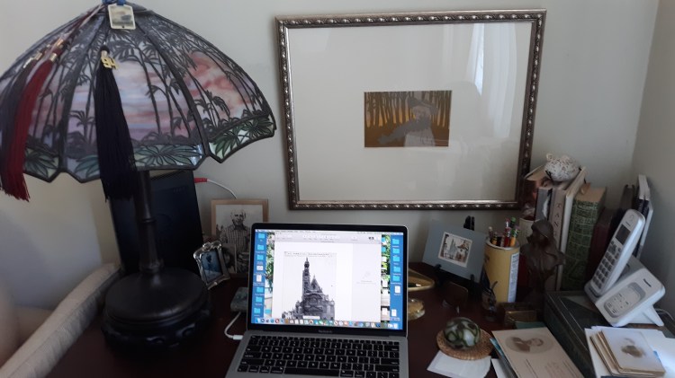 My writing is usually done at my desk, or on my back deck when weather permits…..